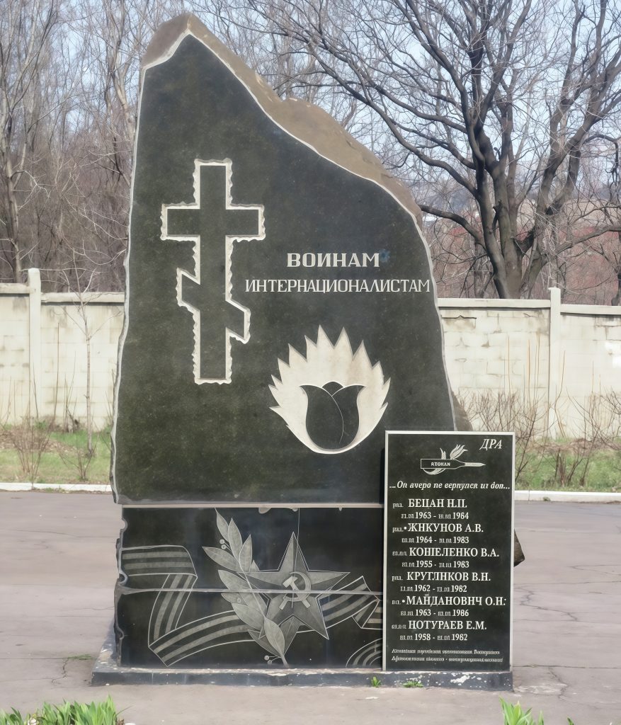 В Алчевске памятник воинам-интернационалистам открыт в сентябре 1998 г. На лицевой стороне черной каменной глыбы надпись «Воинам-интернационалистам», а также изображение православного креста и черного тюльпана в языках белого пламени – символа печали. Внизу – пятиконечная звезда советского солдата и георгиевская лента. Это памятник тем воинам-алчевцам, которые погибли в Афганистане и других международных конфликтах. Памятник изготовлен мастерами-каменотесами из Житомира и безвозмездно передан алчевцам.
