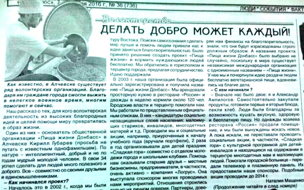 Темы её статей – о рукоделии, спорте, жизни алчевцев. Работа в газете «Рио-Плюс» была отдушиной. Она делилась с читателями добрыми, светлыми и позитивными новостями, и газета предоставляла ей такую возможность. Решение об участии в конкурсе «Хорошие новости Донбасса» приняла с целью показать, что и в нашем городе есть информационные издания, а в них – статьи, несущие позитивную направленность. Это полностью совпадало с её принципами работы в алчевском издании.