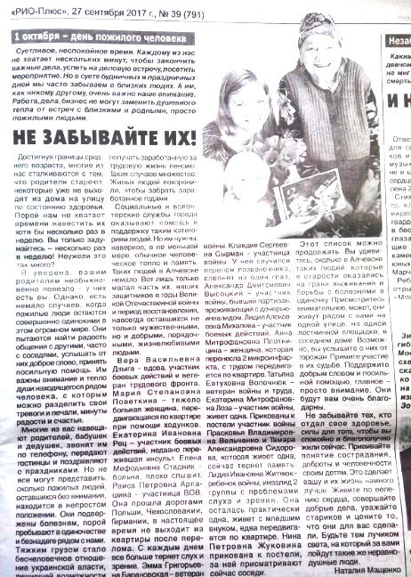 Мащенко Н. Не забывайте их / Наталия Мащенко // Рио-Плюс. – 2017. – 27 сентября.
