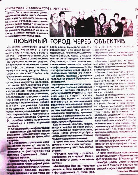 Мащенко Н. Любимый город через объектив / Наталия Мащенко // Рио-Плюс. – 2016. –7 декабря.