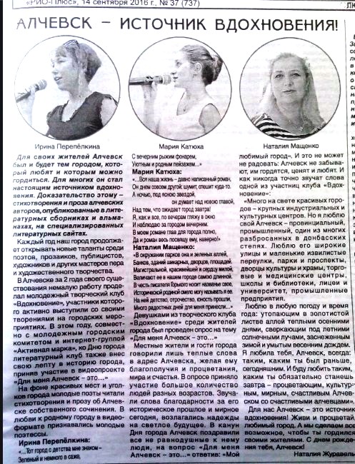Журавель Н. Алчевск – источник вдохновения / / Наталия Журавель // Рио-Плюс. – 2016. –14 сентября.