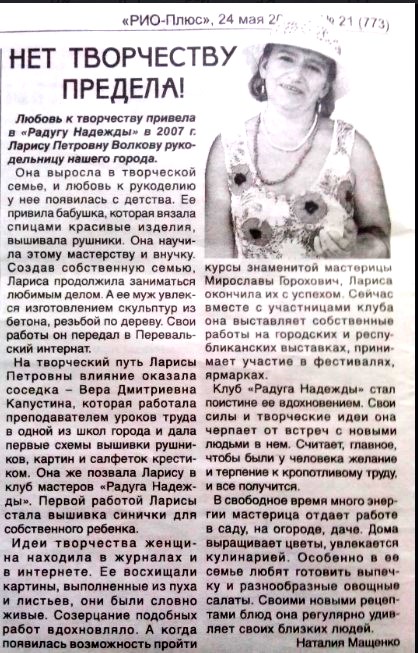Мащенко Н. Нет творчеству предела! / Наталия Мащенко // Рио-Плюс. – 2017. – 24 мая.