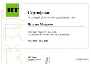 В 2025 году успешно окончила курс ТВ-и онлайн-журналистики школы RT  (телеканал «Россия сегодня» Маргариты Симоньян).