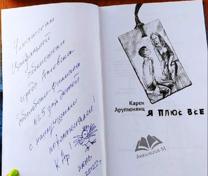 Библиотека-филиал № 5 делится хорошей новостью для читателей. Детский писатель, сценарист, журналист, член Союза российских писателей Карен Давыдович Арутюнянц прислал по почте из России в Алчевск для читателей библиотеки свою книгу – повесть «Я плюс все». Эта повесть в 2010 году была включена литературным клубом «Экспертный совет» московской центральной городской детской библиотеки им. А. П. Гайдара в список лучших книг о подростках. И теперь наши читатели смогут тоже её прочитать. Спасибо Вам, Карен Давыдович, искренне и от всего сердца, от нас и от наших юных читателей! Личная страничка автора книги: https://vk.com/karen_arutjunjants