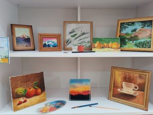 Посетители библиотеки могут познакомиться с работами мастера, окунувшись в богатый мир ее фантазии. Следует отметить, что Ирина очень креативно подходит к созданию своих картин, используя в работе, помимо привычных красок, яичную скорлупу, рисовую бумагу, природные материалы.