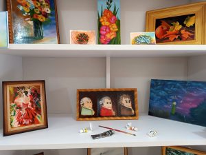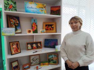 Посетители библиотеки могут познакомиться с работами мастера, окунувшись в богатый мир ее фантазии. Следует отметить, что Ирина очень креативно подходит к созданию своих картин, используя в работе, помимо привычных красок, яичную скорлупу, рисовую бумагу, природные материалы.