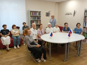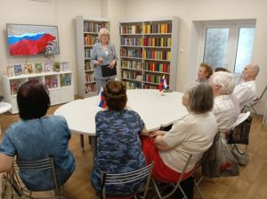 11 июня на Площади общения модельной библиотеки «#БИБЛИОПРОСПЕКТ города Алчевска» для слушателей старшего поколения в рамках проекта «Литературная среда» прошёл информационно-патриотический час «Прекрасна ты, моя Россия!», приуроченный Дню России.