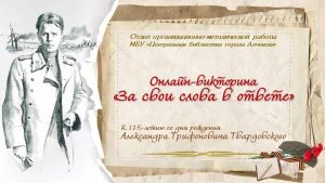 Сотрудники организационно-методического отдела МБУ «Центральная библиотека города Алчевска» подготовили онлайн-викторину «За свои слова в ответе», которая содержит вопросы о жизни и творчестве Александра Трифоновича Твардовского.