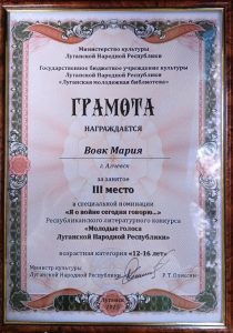 Встреча была посвящена текущей работе клуба, участию наших поэтов в Республиканских и Всероссийских поэтических конкурсах. А первый опыт такого участия у нас уже есть. Юная участница МПК «Мелодия слова» Маша Вовк заняла 3 место в специальной номинации «Я о войне сегодня говорю…» Республиканского литературного конкурса «Молодые голоса Луганской Народной Республики» в возрастной категории «12-16 лет». На конкурс были предоставлены стихи «Партизаны-журавли», «Холокост», «Чёрный тюльпан», «Наш защитник», «Война с неженскою натурой»