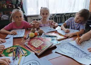 Дети прониклись темой народных промыслов, задавали много вопросов на протяжении всей беседы и после нее. А завершении мероприятия юные читатели раскрасили предложенные картинки в стиле полюбившейся народной росписи и попробовали изготовить семейный оберег – Птицу счастья.