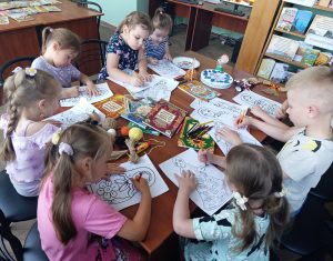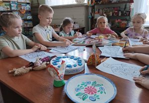 Дети прониклись темой народных промыслов, задавали много вопросов на протяжении всей беседы и после нее. А завершении мероприятия юные читатели раскрасили предложенные картинки в стиле полюбившейся народной росписи и попробовали изготовить семейный оберег – Птицу счастья.