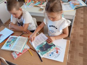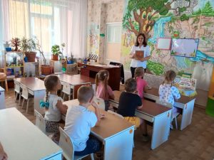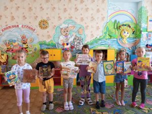 19 августа сотрудник библиотеки-филиала №4 в рамках программы «Каникулы с библиотекой» провела для детей ГБДОУ ЛНР «Ясли-сад №29 «Солнышко» литературный коллаж «У книги юбилей».