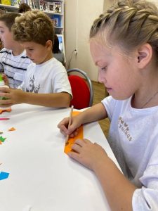 Затем юных гостей ждал увлекательный мастер-класс по изготовлению закладок. В ход пошли цветная бумага, ленточки, бусины – и вот уже в руках у каждого красуется уникальная закладка, сделанная своими руками! Теперь читать станет еще интереснее!