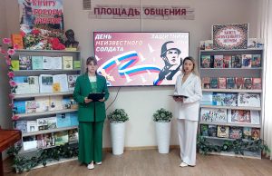 В этот день в читальном зале модельной библиотеки #БИБЛИОПРОСПЕКТ города Алчевска для учащихся 8-го класса ГБОУ ЛНР «Алчевская социально-экономическая гимназия» состоялся час мужества «Мы помним твой подвиг, неизвестный солдат». Библиотекари рассказали об истории установления памятной даты, напомнили о героизме солдат Великой Отечественной и защитников Луганской Народной Республики, имена которых, к сожалению, остались неизвестными. Присутствующие узнали о том, как появилась традиция увековечивать память неизвестных солдат, как она сохраняется сегодня.