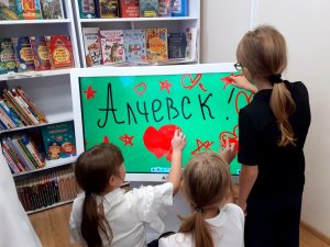 В ходе мероприятия школьники рисовали на маркерной доске и интерактивном столе, создавая яркие и трогательные признания в любви к Алчевску.