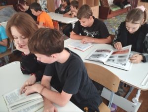 Дети с интересом слушали рассказ библиотекарей и узнали, что у нас много улиц, названных в честь русских поэтов, писателей, деятелей культуры. Ребята внимательно посмотрели видеоролики «Уроки краеведения», «Коммунарск. Алчевск» и познакомились с литературой о любимом городе.
