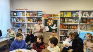 Библиотекарь рассказала школьникам об особой ценности литературных произведений, написанных теми, кто воевал на фронтах Великой Отечественной. В ходе урока ребята познакомились с творчеством известных авторов − Сергея Алексеева, Анатолия Митяева, Льва Кассиля, Валентина Катаева. Их произведения правдиво описывают события военных лет.  Библиотекарь представила юным читателям книжную выставку, где были представлены лучшие произведения о войне.