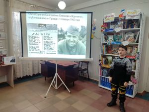 30 ноября в рамках литературной гостиной «Общение» в библиотеке-филиале № 3 прошёл литературно-поэтический вечер «Всю жизнь любил он рисовать войну», посвященный 110-летию со дня рождения великого поэта, прозаика и драматурга Константина Симонова.