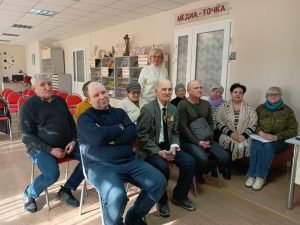 Елена Пляскина познакомила собравшихся с подборкой своих стихотворений для персонального сборника «Я − волонтерских войск простой солдат». Стихи Елены глубокие, тесно связанные с реальностью, человеческими переживаниями, стойкостью и силой духа наших соотечественников. Но напряженность момента неожиданно снял Виталий. Он сел за фортепиано, и в следующую секунду все − и поэты, и художники − с удовольствием пели незамысловатую детскую песенку «Вместе весело шагать».