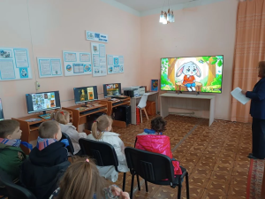 Ребята посмотрели мультфильм «Заюшкина избушка», а затем вместе с библиотекарем размышляли над перипетиями судьбы героев сказки Владимира Даля «Лиса и заяц», искренне переживая за обиженного зайку и радуясь торжеству справедливости.