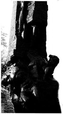 Своим воображением луганские скульпторы и архитекторы раз и навсегда подняли на земную поверхность трагедию шурфа. Колеса вагонеток, куски рельсов, внутренность ствола. Пространство очерчено четырьмя пилонами, на фоне которых изображены фигуры погибающих героев. И мы узнаем об их последних минутах жизни. Здесь, в кровавом мраке, в каменном мешке ведут пленники шурфа свою последнюю битву за жизнь, пепельно-черные, словно обугленные в пламени. Молодой богатырь разрывает веревки, чтобы умереть свободным. Упираясь могучими плечами в каменную глыбу, подняв сжатую в кулак руку, непобежденным встречает смерть коммунист. А рядом – юная девушка, откинув гордую прекрасную голову с косами, выкрикивает проклятия палачам и предсмертный наказ: «Отомстите за нас».