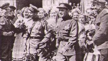 Эти первые бойцы были нерусские, горбоносые и смуглые — либо азербайджанцы, либо армяне. Небритые, грязные, в разбитых башмаках. Зато с ног до головы обвешанные оружием. А командир отделения был русский, разбитной парень. Женщины к нему пристали: «Ну, вы теперь не отступите, вы нас не бросите?» А он сказал — до сих пор помню: «Мы теперь до Берлина дойдем», с ударением на Е.