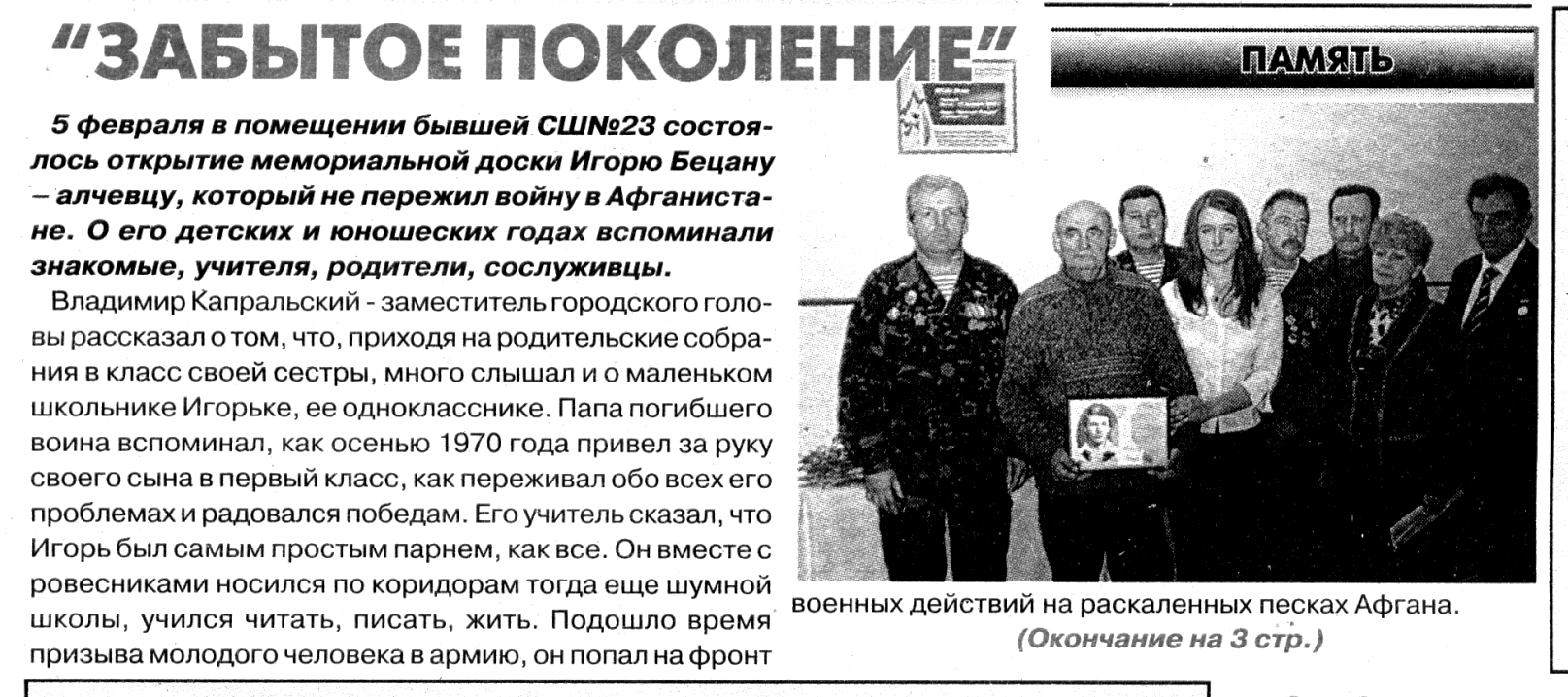 5 февраля в помещении бывшей СШ № 23 состоялось открытие мемориальной доски Игорю Бецану – алчевцу, который не пережил войну в Афганистане. О его детских и юношеских годах вспоминали знакомые, учителя, родители, сослуживцы.