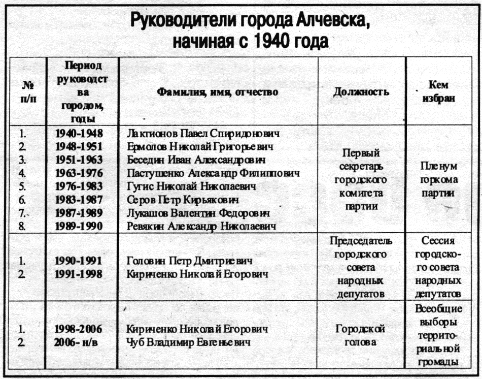 Но в летописи города есть и чистый лист. Мы очень мало знаем о судьбах людей, которые возглавляли город на протяжении всех лет его существования. Кто были эти люди? Кто они – руководители, державшие в руках нити управления городом, под чьим руководством он рос, развивался, приобретал свою неповторимость. Каждый из них прожил вместе с городом какой-то период жизни, продолжил то, что создали его предшественники. Каким бы по длительности ни был период их руководства, безусловно, с ним связаны тревоги, накал страстей и радость от результатов вложенного труда. Так кто же были эти люди? Удивительно, но это малоизвестный факт. В 1996 году к 100-летнему юбилею города был издан справочник-путеводитель «Алчевск». Листаю малую Алчевскую энциклопедию, включенную в это издание. В ней имена тех, кто внес личный вклад в развитие города, оставил след в его 100-летней истории. Нахожу фамилии революционеров, знатных рабочих, заслуженных врачей и учителей, нахожу даже фамилии поэтов, побывавших здесь проездом. Но не нахожу ни одной фамилии тех, кто возглавлял город в течение этих лет, строил его, жил его проблемами, старался оставить добрую о себе память и, я уверена, оставил. Разве они не заслужили, чтобы их помнили или, по крайней мере, знали?