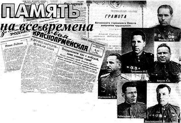 Присланные вами подарки вручены лучшим бойцам, сержантам, старшинам и офицерам – героям боев в окончательном разгроме немецко-фашистских захватчиков. Грамоты почетного гражданина города Алчевска, кроме командования соединения, вручены Героям Советского Союза майору Горохову, ст. лейтенанту Ивкину, лейтенанту Сархошеву, ст. лейтенанту Крутеленко. Денежные подарки индивидуально вручены 133 лучшим бойцам и сержантам.