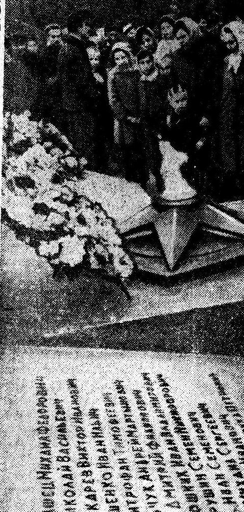 – Мы свято чтим память о тех, кто мужественно сражался с врагом, защищая Отчизну, память о тех, кто спас нашу Родину от коричневой чумы – фашизма, – сказал т. Малков. – Мы открываем мемориальную плиту для того, чтобы не только наше поколение, но и потомки наши помнили всегда, что мы в неоплатном долгу перед верными сынами Родины, геройски защищавшими завоевания Октября. Будем же достойными хранителями их подвигов, продолжателями того великого дела, за которое они погибли!