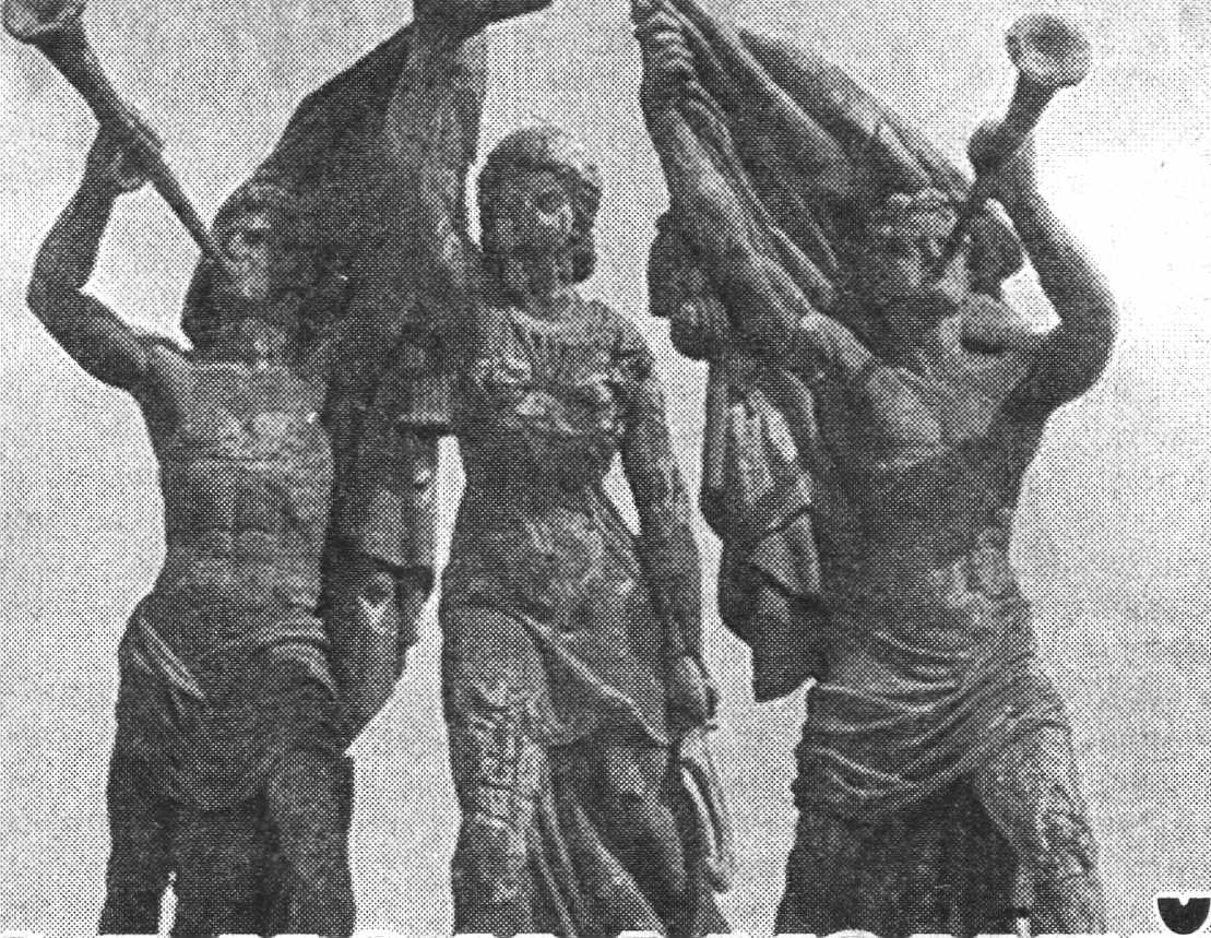 Мастера лепили три фигуры: две мужских, с трубами, а в центре – женская, с лавровым венком. Для нее Василию Ивановичу позировала жена. – Отец рассказывал, что руководил работами Генрих Кюхельройтер, из пленных немцев, – вспоминает Юрий Васильевич. – Наверное, у многих были возражения против того, что такой скульптурой занимается враг, фашист. И тогда придумали, я так полагаю, легенду о том, что Кюхельройтер на фронте ходил за лошадьми, в прямом кровопролитии не участвовал, советских людей не убивал. Не знаю, так ли было на самом деле. Но Генрих был сыном известного в Германии скульптора, сам не чужд этого ремесла, да и человеком оказался хорошим, у отца с ним сложились добрые отношения.