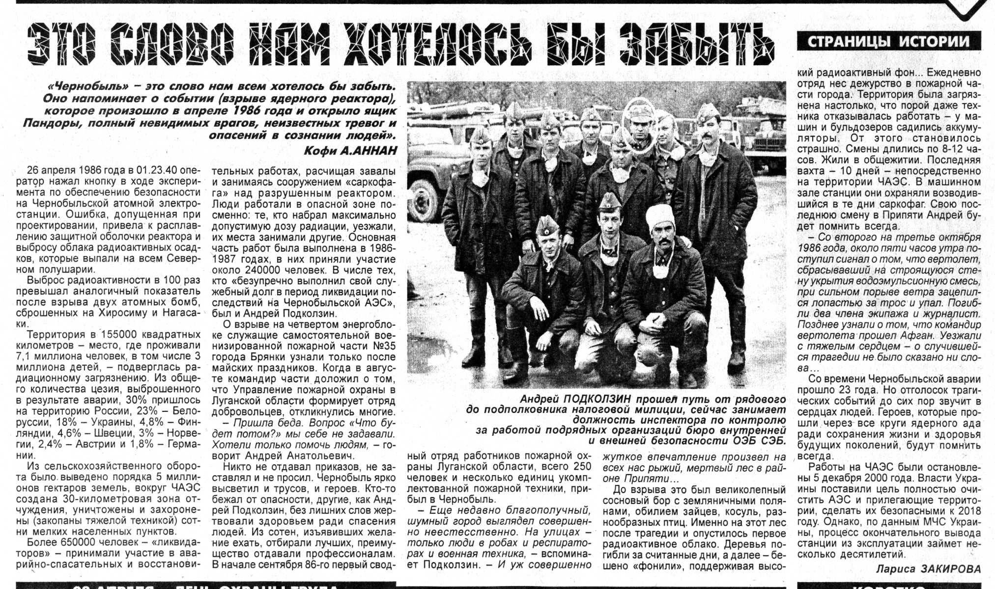 «Чернобыль» – это слово нам всем хотелось бы забыть. Оно напоминает о событии (взрыве ядерного реактора), которое произошло в апреле 1986 года и открыло ящик Пандоры, полный невидимых врагов, неизвестных тревог и опасений в сознании людей» (Кофи А. Аннан)