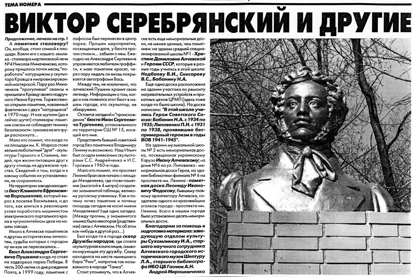 Городские памятники – застывшая летопись эпохи, причем нередко тех ее вех, о которых мы знаем до обидного мало. В сквере Ленинского комсомола находится могила Виктора Георгиевича Серебрянского (1909-1945 гг.). О том, кто этот человек и чем удостоился чести быть похороненным в столь значимом для горожан месте, нынешние поколения алчевцев понятия не имеют. А между тем, могила Серебрянского дань времени, талантливо изображенному в бессмертном телесериале “Место встречи изменить нельзя”, – послевоенному разгулу бандитизма. Секретарь горкома партии по идеологической работе Виктор Серебрянский был застрелен из пистолета через дверь собственной квартиры. Преступление так и не раскрыли. Причем партийный работник был не единственной жертвой свирепствовавших в Ворошиловске в тот период бандитов. Однако похоронили в сквере лишь Серебрянского, отдавая дань его партийным и военным заслугам. При большом стечении народа, с почестями.