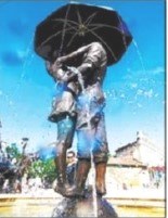 А мимо еще одного нового памятника вы не пройдете точно! «Фонтан Влюбленных» находится на пересечении трех улиц: Галерейной, Русской и Земской. Выполненная из бронзы влюбленная пара под зонтом сразу привлекает внимание. А рядом еще есть и место для поцелуев!